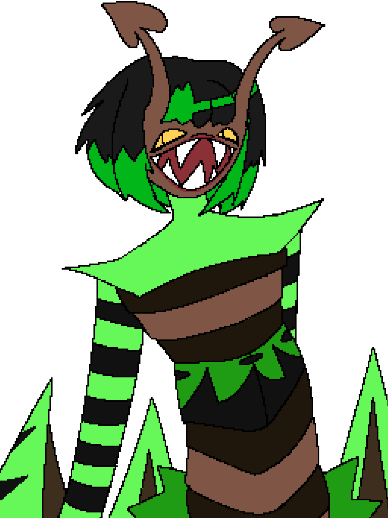 Here's my sona, Preskilla. I chose their name at random as a mix of prescilla and killer to match their appearance of a bug that could hunt humans. They were made as part of an october drawing challenge and I continued drawing them afterward. They weren't created with a specific insect in mind, but multiple mixed together. My main inspirations were spiders, centipedes, and beetles. I chose their main color of green for a radioactive feel, as though this creature could only come to exist through a disaster.